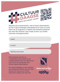 Fanatieke cultuurbezoekers maken bovendien kans op mooie (cultuur)prijzen. Door middel van de (volle) stempelkaart die verspreid wordt via diverse openbare locaties, kun je mooie culturele arrangementen winnen zoals een diner met voorstelling of een jaarlang toegang tot de kleine zaal in Castellum. Op de festivalterreinen is je stempel te halen bij het Mobiele Reisbureau. Te herkennen aan de felle kleuren blauw, oranje en geel.